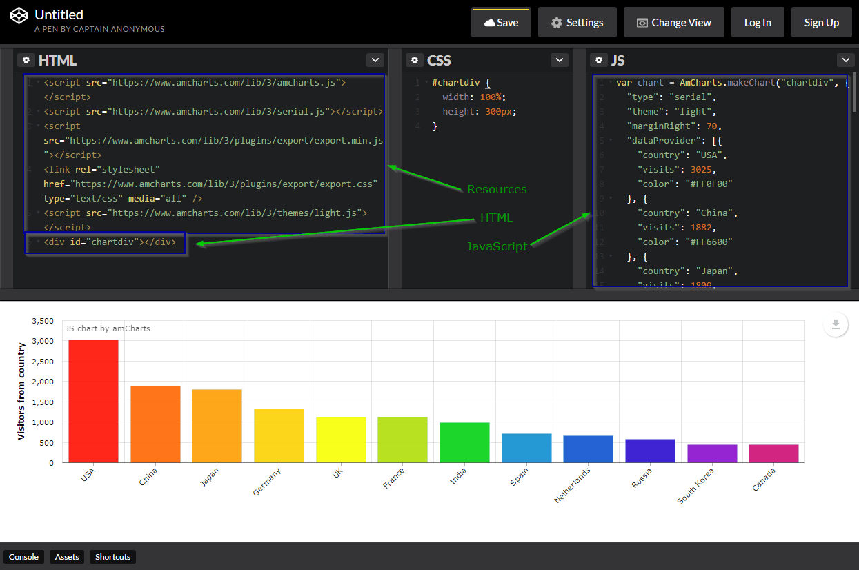 When you click on it, you will get all the components that make up the chart: CSS, Resouces, JavaScript and HTML.